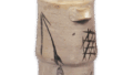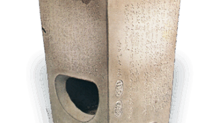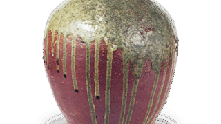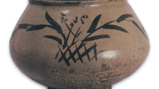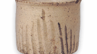 平らな円形の向付で、口縁は端反りに、外側三方に擂座を配し、平らな底の三方に四角い脚を付けています。見込には風にそよぐ芒を風情豊かに白抜きであらわし、立ち上がった内側には縁文様をつけています。同様の向付を五客ずつ十客見ていますが、そのうち二客だけに、外側に鬼板化粧がけの上にさらに矢先のような樹木文を鉄絵具で描いたのが本図の作品であります。鼠色の釉膚はやや青味がちでありますが、底の赤味は鮮やかであります。