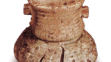 鋭く折りかえした口造はこの種の平鉢特有の作行きであり、四方を摘んで一見花形のようにしています。この鉢も鬼板化粧を流しがけしたらしく、かけ残した白地を生かして文様を構成しています。すなわちかけ残した白地を岩にみなし、そこに一本細かい葉先の木を白抜きであらわし、空に雁を三羽配した巧みな意匠であります。縁の一方は鼠地に、他方には麦藁文と点斑文を配しています。底の四方に脚を付け 見込に小さい目跡が五つ残っています。これも釉膚はよく溶けて滑らかであります。