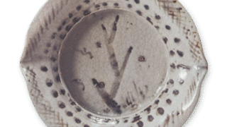 鼠志野の額皿はかなり残っています。これは轆轤でひいたものではなく、いわゆるたたら作りで、薄く板状に切った土を土型に被せて作ったものでしょう。型作りですから形式はほぼ一定していて、直線的に開いた縁をもつ長方入隅形で、四隅にまるく変化がつけられています。これは数ある額皿のなかでも、文様の優美なこと、釉膚の焼き上がりの良さなど出色の作例であります。底の四方に脚を付け、その脚部に目跡が残り、見込の四隅にも小さな目跡があります。文様も岩を中央に野草が描かれ、ややかたい彫りではあるがよくまとまっています。底部の焦げは鮮やかでそこに指跡が残り、また釉膚の鼠色が中央で薄く濃くくっきりと分かれていますのは、半面ずつずぶがけしたのでしょう。久尻の隠居山表窯の作とされています。額皿といいます呼称はもちろん近代のものであります。