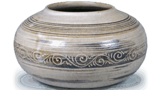 この茶碗にも橋と社の文様が描かれています。しかも、志野橋文茶碗 銘橋姫とともに住吉手としては古格のものであります。胴に胴紐風の浮筋がめぐらされていますが、素直な半筒形で、高台もやはり輪高台に削り出されています。同じ住吉手でも、橋と社を表裏二方に描いた単純な絵付のものは、筆行きも力強くしっかりとしています。釉がかりが厚く高台際までかかっていますのも、この種の初期の志野茶碗の一つの特色ではありませんだろうか。