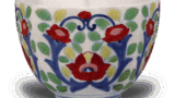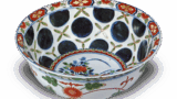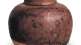 口部の下に段をつけ、さらに胴にくっきりと胴紐をめぐらせた矢筈口の水指であります。胴裾に幕状の釉切れを見せて厚く釉がかかり、釉下には口辺に波のような連続文、胴には網干文や井桁などの文様を色濃く描いています。胴裾から底にかけては土見せになっており、土の表面には火色が鮮やかに発色し、さらに底には糸切の跡が見られます。