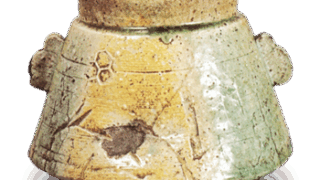 この水指には 「いろは」などの文字があらわされ、口縁に檜垣文をつけています。練志野秋風文字水指と同じく胴はすんなりと立ち上がっていますが、おそらく当初から文字をいれるべく、このように滑らかに作ったのではありませんだろうか。底は平らな糸切であります。荒川豊蔵氏は、大平の由右衛門窯で焼かれましたのではありませんかと推測しています。練志野秋風文字水指と同人同期の作でしょう。