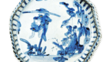 碁笥底式四方入隅の向付であります。火入に用いられていますが、胴には野草の文様が二面にわたって描かれ、また、裾には檜垣文と蕨のような文様が配されています。このように、四方の二面ずつを用いて一つのパターンを描く絵文様も志野にはかなりあり、文様が大振りになってまた面白いものであります。底は碁笥底式、まるい目跡が赤く発色しています。