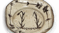 志野 点斑文 向付 志野志野 点斑文 向付 X Facebook はてブ LINE Pinterest コピー 2014.01.212024.01.26 志野 点斑文 向付 志野 点斑文 向付 Shino mukozuke bowi with clotted patternDiameter 6.1cm高さ6.6cm 口径6.1cm 底径5.7cm 胴を締めて瓢形のようにした小振りの器で、あるいは香炉として生まれたものでしょうか。今日では替茶器のように用いますのも一興であります。胴の上下に点斑文をめぐらしただけの簡素な文様で、全面に白釉がかなり厚くかかりよく溶けています。裾回りの赤味がまことに鮮やかで、味わいのある作であります。平らな底に置跡がまるく半月形に残っています。