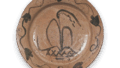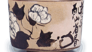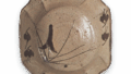 鼠志野 芒文 向付 志野鼠志野 芒文 向付 X Facebook はてブ LINE Pinterest コピー 2014.01.312024.01.26 鼠志野 芒文 向付 鼠志野 芒文 向付 Gray Shino mukozukeDiameter 14.4cm高さ4.7cm 口径14.4×14.4cm 三脚 鼠志野の向付には優れたものが多く、これも代表的なものの一つであります。口縁を内に捻りかえし、口部を撫四方にした平らな向付で、腰に段をつけて見込は深くなり、底の三方に脚が付いています。見込には芒の文様が白くくっきりとあらわされ、また鼠色の釉膚も厚くやわらかであり、ことに底の赤い焦げは鮮やかで、この種の鼠志野向付のなかでも、図34の作品とともに代表的なものの一つでしょう。