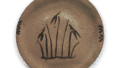 鋭く内にかかえ込ませた口縁を撫四方にした平らな向付で、見込に笹のような文様をあらわしています。鼠志野としてはやはり優れた作品の一つで、厚くかかった釉膚はややかたく焼き上がっていますが、鼠色の発色は鮮やかで、底回りも赤く焦げて美しいです。これらの向付は見込に小さい目跡が三つ、三方に付けられた脚の間に大きくまるい目跡が三個残っていますが、それは立錐形のトチンを用いた重ね焼の跡であります。