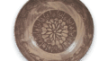 鼠志野 飛鳥文 向付 志野鼠志野 飛鳥文 向付 X Facebook はてブ LINE Pinterest コピー 2014.02.062024.01.26 鼠志野 飛鳥文 向付 Gray Shino mukozuke dish With design ot bird in flightDiameter 15.3cm口径15.3cm 撫四方にした口縁を内に折り込ませた向付で、底には脚が三方に付いています。見込に燕らしい飛鳥を三羽のびやかにあらわし、鐔の部分に点斑文など縁文様をめぐらせています。釉は濃い鼠色にかたく焼き上がり、底には赤い焦げが生じています。