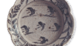 やはり波に千鳥を主文様とした向付で、撫四方の口部には二種類の幾何学文様が描かれています。釉がかりが厚く、焼成りはかたいが、文様はくっきりと黒灰色に発色しています。唐津焼の向付とも共通した意匠であります。底に付けられた脚は小さめで、脚の間にまるい置跡が残っています。