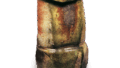 角耳に、六角に面取りされて裾が開き、下半七分までうずめた焦げもビードロ釉に包まれて光沢を放ち、ビードロ釉は左側面の赤い胎土にまじえて萌黄色を流してもいます。