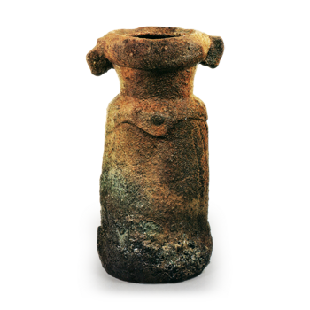 俗に唐犬耳とよばれていますが、口の左右に方形の耳をつけた珍しい姿の花入であります。口縁は内にすぼまって、肩はまるく張り、胴はわずかに開きつつ裾にいたり、がっしりとした底部がそれをうけています。肩下に山路状に起伏するやや深い箆彫りをつけ、胴の左右に浅い縦箆目を一筋、二筋、背面にも指先でつけたような太い縦筋を一筋くっきりとつけ、胴裾にも横に深い箆目をめぐらしています。表には厚く激しく灰が降りかかり、上部は暗褐色に焦げ、左下半部は暗い緑青色の釉膚があらわれていますが、そのさまはあたかも苔むした巌を思わせる。一変して背面は無釉、淡褐色の焦げ膚になり、裾まわりのみ黒く変化しています。底は平底で窯割れが生じています。これも肩に欽付穴を填めた跡があります。