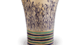 ほぽ直線的に頸部が立ち上がり、胴はゆったりとふくらみながら裾張りになり、頸の左右に折釘のような耳をつけています。やや厚手に成形され、正面に伊賀焼花入のなかでも特に鮮やかなビードロ釉がかかっています。正面と背面を凹ませ、裾まわりに強く箆彫りを入れて段をつけています。背面は赤く焼き締まり、肩にたまった自然柚が三条流れ、また□部から胴にかけて鉄釉が二条流れています。背面に執付穴を填めた跡があります。東京の数奇者が所持した「東五人男」と呼ばれた五本の名作花入のうちの一本にあげられています。