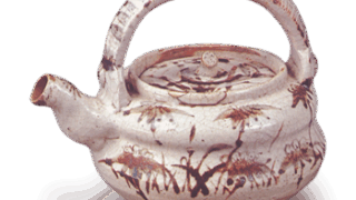 この作品も「東五人男」の一つで、かつて有賀家に蔵されていたものであります。開いた口部を内にすぼめ、引き締まった頸部から胴部にかけて左右に耳をつけ、裾張りぎみに直線的に立ち上がった胴は七角に面を取っています。口部と肩に山路風の箆目をめぐらし、各面に縦箆目を一筋、または二筋、三筋とつけています。降りかかった灰釉は滑らかに溶け、草緑色のビードロ物が鮮やかであります。備前や伊賀の花入には胴に面を取ったものをみるが、七面体のものは稀であります。底は平底で、土膚はかたく焼き締まっています。