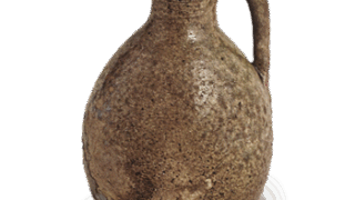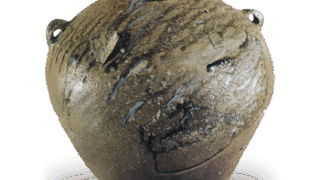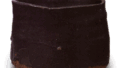 ふくらんだ胴に大きな窯割れが一筋。小さく縦横に一筋ずつ入っています。全体厚手で、いかにもどっしりした伊賀焼ならではの力強い作振りであります。胴の上部には七本の横筋をめぐらし、左右に長方体の耳をつけ、底は平らに成形されていたが、焼成中に窯割れなどが生じて姿が大きく歪んだため、後に前二方に小さな脚をつけて傾きを補正しています。若草色の灰釉が正面にずっぽりとかかり、背面と底はほのかに赤く焼き締まって、底に円形の大きな置跡が残っています。本来「破袋」の銘はなかったが、重要文化財指定に際して名付けられた。