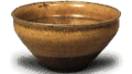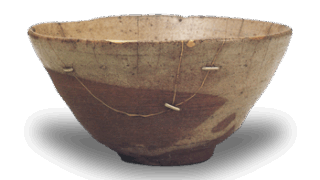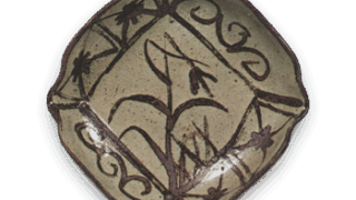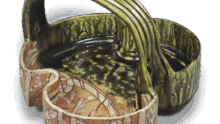 大きく外に開いた□部に緩やかな起伏をつけ、頸に四段の線彫りをめぐらし、その左右に小振りの耳をつけています。裾張りぎみの胴は撫四方にし、裾に面を取り、胴の各面には一本、二本交互に縦箆目をつけています。口部から正面胴裾にいたるまで灰か激しく降りかかって黒く赤く焦げ、まことに渋い景色に焼き上がっています。背面は赤く焼き締まり、頸部の段のところに緑色のビードロ釉がたまっています。