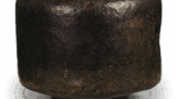 頸部は直線的に、ふくらませた胴は三方を押さえ、底は円座状に作り、左右に細い管耳を配しています。頭部に線彫りの檜垣文様をめぐらし、胴には山路状の横櫛目と縦筋をつけています。正面には自然釉が厚く降りかかり、一部は青く、一部は暗緑色の焦げ膚に焼き上がり、背面は赤く焼き締まっています。底に三個釉流れのくっつきがあり、背面に紋をつける。