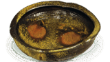 全体厚手の水指で、胴を強く引き締め、正面を平らにし、他は不正にまるくしています。正面の上下に縦箆目を三本ずつつけ、背面には上部に四本、下部に三本、さらに下部には横箆目を二筋上下にめぐらしています。大きな耳が左右についています。正面に灰が降りかかり、浅い草緑色のビードロ釉となり、背面は赤く焼き締まり、口部にも灰が降っています。また耳の下には叩文が見られます。珍しく共蓋が添っています。