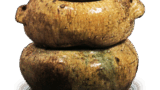 伊賀耳付水指 伊賀伊賀耳付水指 2019.03.072024.01.23 伊賀耳付水指 Water jar with two handles Height 20.2cm 高さ20.2cm 口径14.0~14.5cm 左右22.0cm 底径18.5cm 口端を一段内に落として肩には面をとり、胴を一段絞って裾広がりにした独特の器形で、左右に大振りの耳をつけ、上段は撫四方にしています。正面には灰が激しく降りかかって美しい景色のビードロ釉となり、背面は赤く焼き締まっています。耳の脇に鉄釉が一筋流れています。