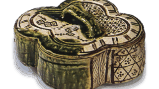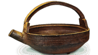 厚手の沓形茶碗で、伊賀焼の沓形の茶碗や鉢はほとんど同様な形式に作られています。□部に段をつけ、高台を低く削り出し、ロ部から胴の半面にビードロ釉がたっぶりとかかり、半面赤く焼き締まった膚に長石粒があらわれています。また、この手の茶碗はロ部に平らに箆目をめぐらせているのが特色であり、見込も広く、そこに箆目をつけています。この種の沓形茶碗のなかではもっとも優れたものの一つであります。箱の蓋裏に「伊賀焼茶碗捨石ト号左(花押)」と表千家八世啼啄斎が書付しています。江戸時代初期の作でしょう。