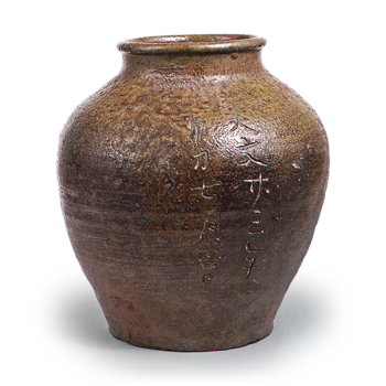 内に斜めにすぼめた独特の口造りをなす水指で、口縁は緩やかに起伏し、全体的にざんぐりとした詫びた作振りであり、素朴な紐のついた平らな蓋が添っています。背面の口部と正面の口辺から胴にかけて黄緑色の釉が降りかかり、土膚は全体に茶褐色に焼き締まり、大小の長石粒が全面にあらわれています。底は平底で、二か所にくっつきの跡が残っています。伝えによると、利休から古渓和尚に伝わり、さらに大徳寺塔頭玉林院の什物となったもので、内箱の底に武者小略千家一世一翁宗守が「利休しからき水指宗守(花押)」と書き付け、蓋表にも「玉林院」と書されています。