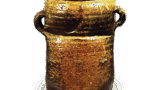 桃山時代後期の作と思われるもので。信楽矢筈口の典型的な作例であります。ことに土膚の景色はまことに美しく、正面ほのかに赤みをおびた土膚に薄く灰が降って、黒く焦げています。これとまったく同様の作振りのものが、有来新兵衛屋敷後(京都市中京区三条柳馬場東入ル)から出土しているのは興味深い。新兵衛は慶長年間に活躍した京都の町衆で、徳川家康と交わりがあり、古田織部とも親交があった数奇者で、二条の唐物屋であったと伝えられています。その屋敷後がらは志野や瀬戸黒。織部、備前なども出土していますので、おそらく茶陶の流通を図った町人であったと推測され、この種の信楽も彼の商品であったのではないかと考えられるが、新兵衛自身も作陶を試み、また好みの作を窯場に注文したものと推測される。しかし、新兵衛ものに関してはなお今後の考察を待ちたい。胴の上部と裾に段をつけ、□は矢筈口風にしています。備前にも同様のものがあるが、信楽の器形はより素直であります。見込に「シ」の印が箆彫りされていますが、新兵衛の手印であります。共蓋も赤く焼き締まっています。