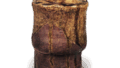 丹波焼の茶入中第一の名作として名高いものであります。遠州好みといわれていますが、その優しい姿は確かに遠州好みを想わせる優美な作振りであります。口縁はまるく端反りにし、撫でた肩の左右に小さな耳をつけ、裾張りぎみの胴はごく僅かにふくらみをもたせ、腰はまるく、底にはくっきりと糸切の跡が残っています。明るい茶色の釉がロから裾にかけて厚くかかり、前後に黒釉があらわれています。唐物茶人の作行きを範とした和様の茶入といえよう。