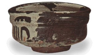丹波茶碗 銘大ぐり 丹波丹波茶碗 銘大ぐり X Facebook はてブ LINE Pinterest コピー 2019.07.242024.01.24 丹波茶碗 銘大ぐり 高さ7.3cm 口径10.4×11.3cm 高台径4.8~5.2cm京都民芸館 箱蓋裏に表千家六世覚々斎原叟が「丹波ヤキ茶碗銘大クリ覚々斎(花押)」と書付しています。その作振りは手担ね風であるが、まさに大栗の名にふさわしい姿で、やや抱え口にざんぐりと成形し、高台を低くしたたどたどしい作振りの茶碗であります。全面に紫褐色の釉をかけていますが、一部黒く窯変しています。□に金繕いが二か所あります。藤田家に伝来したもの。