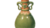 この手の鉄絵粉青を俗に鶏龍山(けいりゅうざん)と呼びますが、これは窯が忠清南道公州郡反浦面の鶏龍山山麓、鶴峰里に位置するためです。高台裏には白化粧がなく、畳付を除いて全面に黄色味をおびた透明釉がかかっています。この手の瓶は、小さく引き締まった高台に特徴があり、本器もその例にもれません。器の表には何本かの圏線が廻らされ、胴の中央には如意頭文と蔓草と想われる文様が手慣れた速い筆致で描かれ、速度感と軽快さを魅力とされてます。