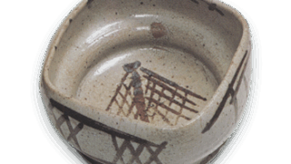 姿は筒形の深い茶碗で、胴にはゆったりとした轆轤(ろくろ)目がまわり、上から見ると楕円形の一方が、つぶれたような形をしています。口作りはたっぶりとして厚く、波のように起伏があり、内側に箆目がありますが、あまり目だちません。腰には木箆で斜めに太い線を加え、形を引が締めているのが、この茶碗の見どころになっています。