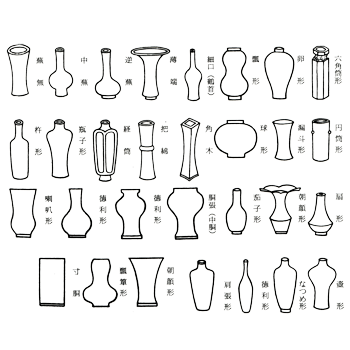 今日作陶家や愛陶家などは「カビン」、中国趣味の人は「カヘイ」、挿花者は「花器」、茶人は利休以来会記に「花入」と称しています。