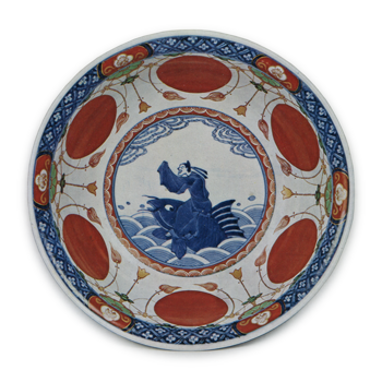 ,染付(そめつけ)の藍(あい)色の下絵に、上絵の金、赤、緑、黄色などで装飾した作品を「古伊万里様式」と呼んでいますが、藍色と金、赤の組み合わせが基本で、金欄手(きんらんで)の古伊万里と呼ばれることもあります。