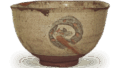 見込みには目はなく、高台には、判然としませんが、八つほど残っています。蓋表に金粉字形で「上林」の二字を表した欅製の箱に納まっていますが、上林の銘は、おそらく安土・桃山時代の宇治の茶師、上林竹庵が所持していたという伝えによったものと推測されます。
