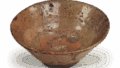 この茶碗の何よりの見どころは内面の釉調で、ほのかに青味をおびた釉薬が見込みになだれかかった調子が実によいです。見込みに近く目跡が五つあり、口縁に小さいほつれが三つあります。