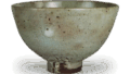 このように外側は、轆轤(ろくろ)目が立っているのに反して、内部はあたかも撫でつけたように、なめらかな膚をなし、見込みはかなり深く大きいです。ただし、腰のところにみごとにくっきりと二筋、轆轤(ろくろ)目が浮き立ち、そのために見込み全体分作ぶりを、すっきりとした軽快味あるものとしているのが印象的です。釉がかりは総体的に薄いですが、ほぽ平らに、なめらかにかかっているのが特色で、その色調を例によって青みと黄みの片身替わりになっていますが、裾まわりはほとんど黄みがちであり、腰から上半部のみ、半面にあたかも、かすみのたなびいたように、灰青色に変化し、そこにぽつぽつと斑紋が現われています。