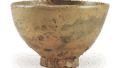 轆轤(ろくろ)成形が、おおむね単調であるのに対し、色調は内外とも複雑微妙、変化に富んでいます。釉膜は例のごとく薄く、その色調が、ほとんど素地の発色によっていること、常のととやと同様です。淡い黄白色から朽葉色と呼ばれる灰黄色、少し赤みをおびた黄色でやや濃い赤かっ色と変化を示す中に、ところどころ、青みをおびた灰白色の斑紋がむらむらとあり、また小さい御本も点々と出ています。そして外側口辺近いところに、濃い鉄の黒点が一つ飛んでいます。偶然の出来ですが、これがまた効果的な景色になっているのです。