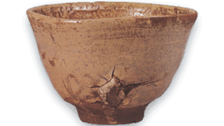 器の上半は薄く、裾以下はかなり厚くかかったのを、一部きわめて無造作にぬぐいとったあともあります。また高台の内外では釉はげが大きく、かっ色の地膚が露骨に出ています。さらに畳つきにぱ目跡が黒ずみ、そして、ぬぐい残しの釉層は梅花皮(かいらぎ)になって、このあたり一帯、まことに荒涼たる景観ですが、この茶碗の最も重要な見どころでもあります。