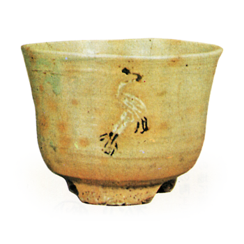 御本(ごほん)とは、手本をもって作られたという意味。本品は、三代将軍徳川家光(1604~51)が鶴の絵を描き、小堀遠州(1579~1647)が切紙をもって朝鮮に注文したという伝承があります。