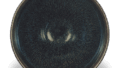 土は赤みのある建窯独得のもので、高台が比較的大きく、全体にやや開きかげんの作です。釉はたっぷりとかかり。一部では高台の裾にまで及んで、あとで擦っています。青黒い深みのある釉面に、銀茶色の油滴がまんべんなく浮かび上がり、非常に美しいです。油滴の形はほぼ円形に近く、最も好ましい状態で火が止まったことがわかります。建窯の天目は、たいていロ縁に覆輪がかかるものですが、この天目には添っていません。利休在判の尼崎台がついており、いかにも由緒の正しい名品といえましょう。