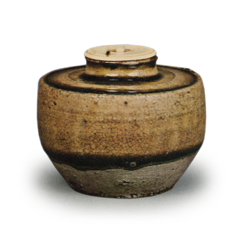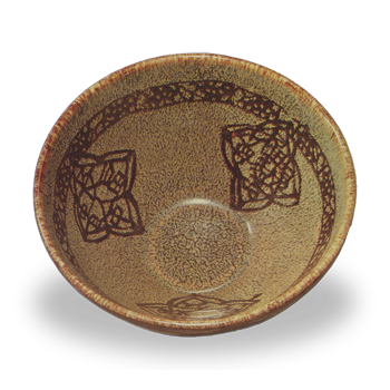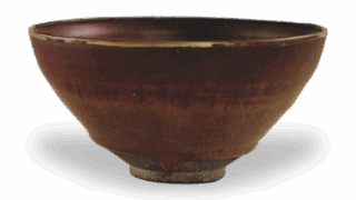 これも見事な伝来の玳玻盞です。形はやや開きぎみの碗なりで、造りは例のごとく、外側は黒地黄斑の玳玻釉になっています。その点からすれば、これも玳玻盞とよぶべきものなのですが、中の文様が特殊なものについては、その文様名を冠して、このように文字天目とよぶのが昔からのしきたりなのです。