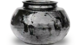 これも中の文様をとって、鸞天目(鸞はおおとり)とよぶことがありますが。ここでは箱書に従って玳玻盞とだけしておきます。土や造りは決まりのとおりですが、ロ縁部に建窯の天目と同じようなひねり返しがついています。この形式は吉州窯の玳玻盞では余り多くありません。外面は例によって玳玻釉でおおわれていますが、卯の斑釉がいくぶん淡いため、黒下地が強く出て、いつもの玳玻盞と少し調子が違っています。