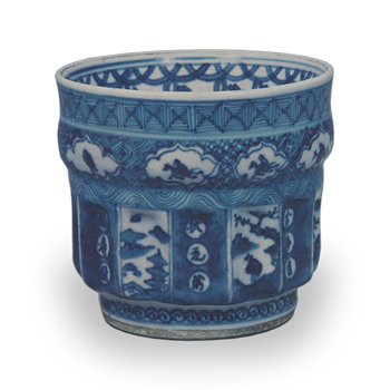 そして図で見ればわかるように、その各部につく文様がそれぞれに趣好をこらして、楽しい変化を見せてくれます。ことに腰の面取り部では、一面おきに瑠璃地窓抜きで詩句を書き、その間の面には、文雅な山水人物を配するといった、非常にしゃれた構成を見せてくれます。染付の色合いも鮮麗で、最高の作といってさしつかえません。