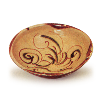 筆で簡単な花文や鳥文・斑点文を彩描したものもあれば、団花や葉形の貼花文を施した上に褐斑を漬したものもあります。