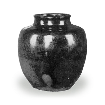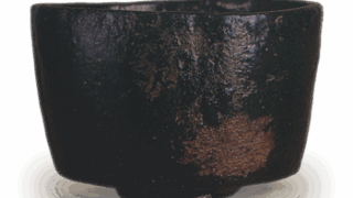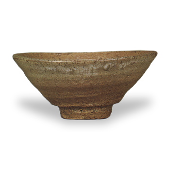 竹の節高台やや大ぶりに、口辺まで直ぐにのびた胴には轆轤目よく立って、脇取りも手強く、鋭い作行きを見せています。青井戸特有の釉肌のうちに枇杷色の上がりも見えて、片身替りの景をなしています。高台辺はことに脇取りのかいらぎ鮮やかで、口辺の釉溜りは秀れた景となって、この茶碗にいっそうの趣を加えています。見込みに目四つ。