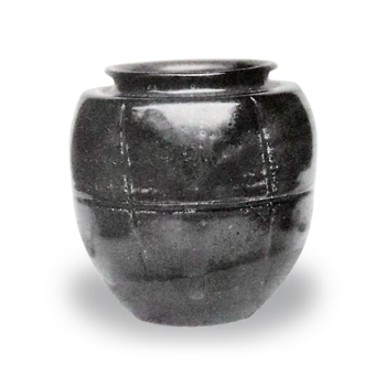 総体に栗色地に黒飴釉の景色が現われ、肩先その他に釉ぬけが点々とあるようで、甑廻りに黒釉が一面に掛かり胴紐の辺より黒釉が幅広く段々になだれ。