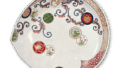 【三島手】文様は押型を用いて点線文・波状文を縦列に、あるいは蛇の目文・剣先文・雷文などを横列に器物の表面に押し付け、白土をその上に塗って凹所に嵌入させ、そのあと文様外の白土を削り取り、釉薬を施して焼成したものです。