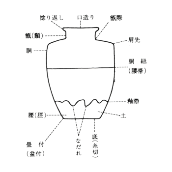 【茶入の見所】茶入の鑑賞上そなえるべき条件を指して茶入の見所といいます。(一)五ヵ所の見所茶人をその姿体からして口・肩・胴・腰・糸切の五ヵ所に分けて、おのおのその見所を挙げることで、古来名物と称せられる茶入には必ずこの見所があり、その五ヵ所が均等整然としているのを最もいとします。まず口造りは柔かい中に気勢がありかつ整ったものをよいとし、口造りの捻り返しはすらりとしたのを尊重します。この捻り方に丸がえし・平がえし(一文字)・口紐の三種があります。また口より肩までの間すなわち甑と称する個所も見所でああって、捻り返しとよく釣り合う必要があります。肩は茶入の形態美を左右する最重要点であって、茶入の形式により春慶肩・撫肩・丸肩・段肩などの種類があります。胴にもそのつくりによって胴高・胴張などの語があります。なお胴の中間をめぐる胴紐(腰帯)は茶入の姿全体を引き締めますので、これまた重要です。腰は、肩から胴さらに腰と次第に曲線を描いてついに底に及ぶところであり、また釉際の位置するところでもありますから、胴と共にその線条の見所が特に微妙です。糸切とは底面の糸切の個所で、また畳付あるいは盆付とも称し、茶入を置いた時にその底の坐り具合もまた見所の条件です。糸切が左廻りなのは唐物、右廻りなの和物であるとするのは古来の説ですが、一概には決定し難いです。また渦糸切・丸糸切の名もあります。ほかに起こしあるいは板起こしと称してベタ底のものもあり、これは品位が下がるとされています。(二)釉茶入の生命は姿と釉にあります。釉には地釉・上釉・なだれ釉があって、鑑賞上これを景色と称しています。釉についての今泉雄作の説の大要を述べますと、次のようです。「春慶釉は一色の釉で成り、上に水釉が吹き出ています。朝日春慶は東雲に朝日が映えているようにみえます。一般にいう瀬戸釉は、大概は茶の地釉で上に黒が掛かり、なだれは黒・黄もあります。黄釉は二代藤四郎よと伝えられます。釉切れとは上釉の下に地釉がわずかに残っているものです。鶉斑とは上釉の黒斑をなして残っているもの。なだれの中で襷なだれとは網目のような景をいいます。名物で例を挙げると雪柳春慶がそれです。釉変わりとは火加減でなだれの色が変わったものをいいます。釉際の中に破風・山道・一文字があります。破風は釉際が破風形になっており、山道とは高低差の曲線をいい、一文字とは高低がなく一直線になっているものをいいます。火変わりとは肩付の角度がカツキとなっているので地釉が変化したもの。片身替りは前後半身ずつ色変わりになったものをいいます。内はげというのは内面に釉の掛かっていないところがあるもの裏釉とは茶入の裏に釉変わりの入ったものをいう」。なお茶入に置形というものがあります。置形とは茶事の際に茶入の景色のある一面、または最も重んずべき個所を見立てて、これを器体の正面として取り扱うことです。なお茶入の窯分および茶入一般について書いてある書物を掲げておきますと、『別所吉兵衛一子相伝書』宝樹庵『瀬戸窯分』一玄庵『茶入の審分』『瀬戸陶器濫觴』『茶器弁玉集』『万宝全書』六・七『茶湯評林』『三冊名物記』『茶入目利之書』『古今名物類聚』『茶家酔古襍』『本朝陶器攷証』『茶入の見方』『高麗茶碗と瀬戸の茶入』。※からもの ※めいぶつ ※いときり