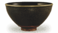 前作と同じたちの油滴天目ですが、金属の覆輪をかけるかわりに、縁だけに白化粧を施して白覆輪としたもので、その白縁を除けば、土や釉だちは、ほとんど前作と同じで、おそらく北方の一つの窯の産でしょう。白化粧という、特異な技法を用いていることと、その白化粧の調子からいって磁州窯系の、ある窯の産と見てもよいでしょう。土は、本来、白っぽい焼き上がりになるものらしく、釉の薄くなった指あとのあたりに、その気配がうかがえます。高台ぎわの土見になる部分に、鉄分の多い塗り土をしているため、その本来の白地が、隠されてしまっているのです。あとに出て来る、竜光院や藤田美術館の油滴天目も、これと同じ塗り土をしています。本場の建窯の土見が濃かっ色ですので、それに似せようとして、こういうことをしたものらしいです。