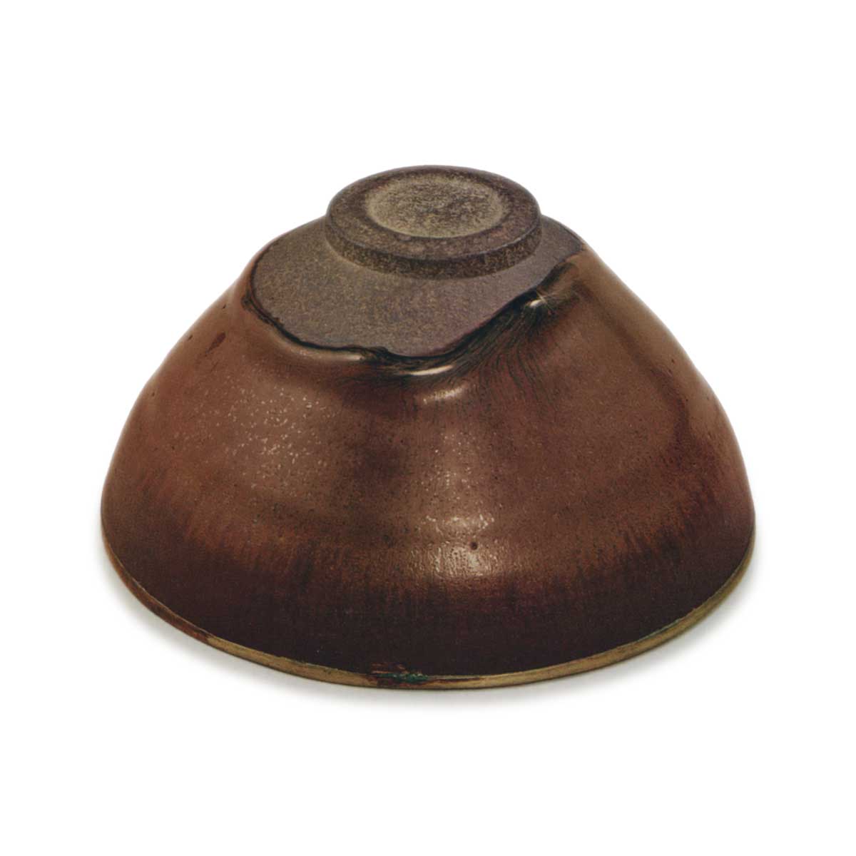 おそらく建窯の天目では、こういう釉調は、きわめて異例のことだったに違いありません。どうも初めから意識して作ったのではなく、偶然にこの茶碗の釉だけが、鉄分が多かったということではないでしょうか。それでも裾の釉だまりや、見込み中央のあたりでは、ガラス釉がたっぶりとしていて、柿色の筋が兎毫盞に流れています。