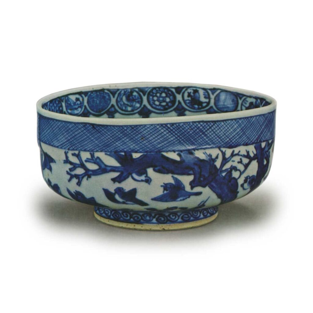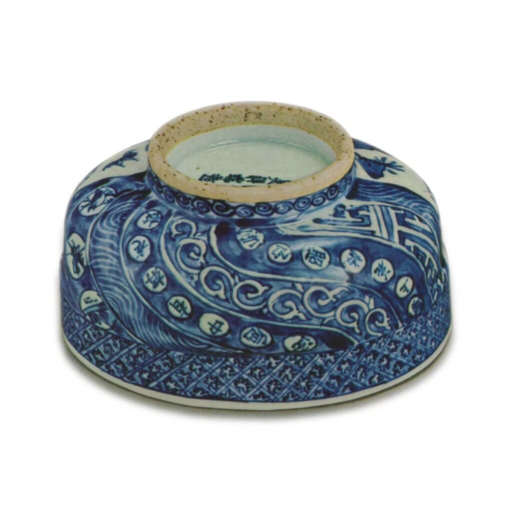 純白の膚には、祥瑞独特の美しい藍で、しゃれた紋様が描かれます。藍の色は、明の正徳・嘉靖期に盛行したバイオレット・ブルーで、よほど呉須の質がよくありませんと、この色は出にくいです。特選の注文品ということで、とっておきの原料を使ったのでしょう。外側は、先に述べたとおり、二面の紋様から成ります。片面は老樹飛雀で、枯木をめぐって、飛び交う群雀を描き、片面には、瑠璃染めに白抜きした、ねじ飴状の祥瑞紋様を、べったりと描き込んでいます。雀のほうの上縁には、細かい網目紋を配し、祥瑞紋の上には、石畳紋をめぐらします。