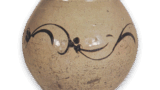 この皿は元禄銘をもたないが、その作風から推して明らかに同類の一つと考えられます。見込はやや深く、鐔状の縁には段をつけ、口縁は低く立ち上がっています。見込中央に雲をあしらった団龍文をあらわし、鐔状の縁には三方に菊唐草、その間に青海波文をあらわしていますが、菊唐草の表現は鍋島に極めて類似していますので、この手のものをかつて俗に「柿鍋」 (鍋島調の柿右衛門) と称していた。外側には唐草文様が染付でめぐらされていますが、その発色もまことに鮮やかであります。高台内に目跡が三つ残っています。