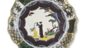 田中丸コレクション円形の染錦手鉢で、図130は見込円窓内に染付で山水文をあらわし、そのまわりに岩牡丹の図を二方に配し、外側には唐草文が染付でめぐらされています。文様などの表現は古風で、おそらく延宝以前の作と推測されます。図131も見込に染付で滝山水の図をあらわし、まわりには一方に籬に菊、他方に牡丹の文様を配しています。外側には染付で牡丹文をめぐらし、それには色絵を点じています。